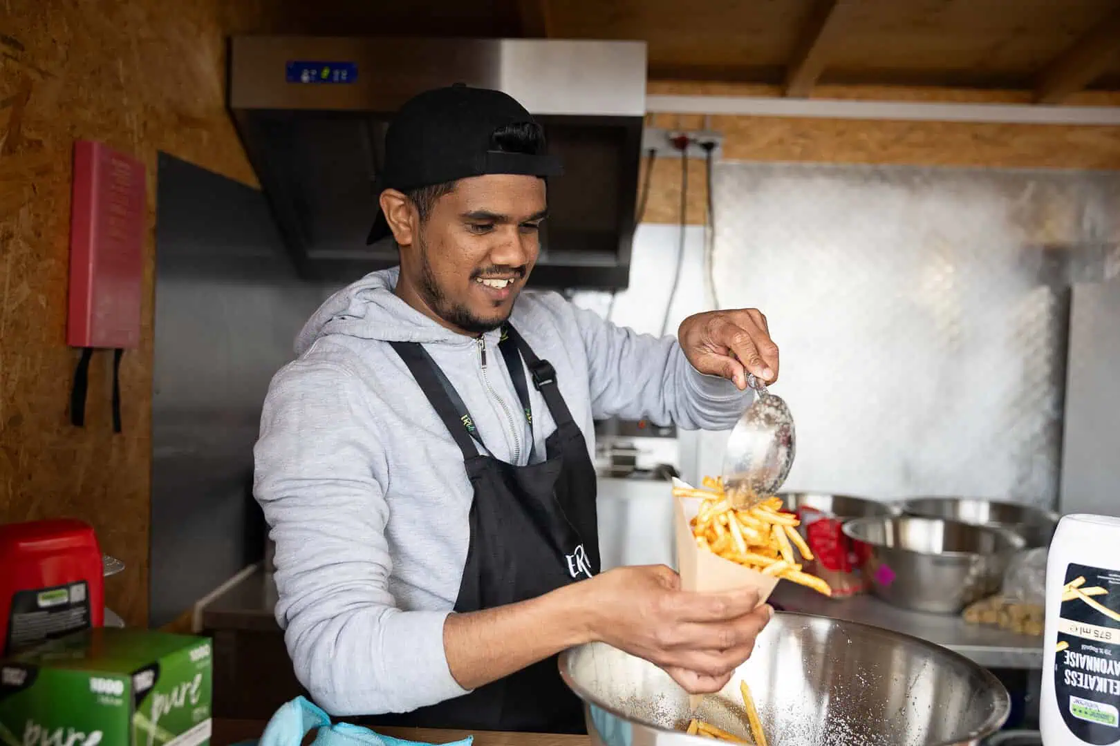 Im Kiosk: Wir versorgen unsere Besucher den ganzen Tag über mit Kaltgetränken, Pommes und Süßis. Ob wuselige Schulklassen oder alte Hasen: du behältst die Ruhe, wenn jemand mal länger braucht, um eine Auswahl zu treffen oder alle auf einmal was möchten. Diese kurzen Begegnungen machen dir Spaß und das kommt rüber.